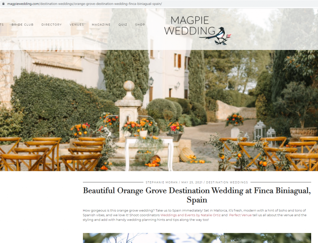 The blog Magpie wedding has featured Beautiful Orange Grove Destination Wedding at Finca Biniagual, Spain.